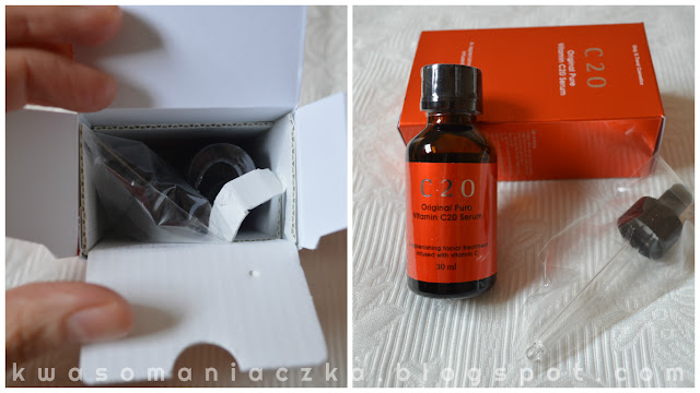 O.S.T. Original Pure Vitamin C20 Serum jest w brązowej, szklanej buteleczce chroniącej kwas askorbinowy przed przedwczesnym utlenieniem. Buteleczka jest szczelnie zamknięta zwykłą zakrętką ale w kartoniku dołączona jest szklana pipetka, konieczna do precyzyjnego dozowania serum. Bardzo przemyślane oddzielne zapakowanie buteleczki i pipety, chroniące przed stłuczeniem w trakcie transportu. Myślę, że idealnie byłoby, gdyby serum było w pojemniczku uniemożliwiającym dostęp powietrza (airless pump) ale ostatecznie może być i tak.