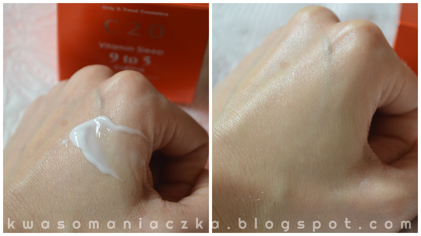O.S.T. Vitamin Sleep 9 to 5 Crema is unfortunately less spectacular product. The texture is quite lightweight gel-cream, fairly easily absorbed but the content of mineral oil creates a film on the skin, which I absolutely hate... My skin suffocates under this sort of blanket and it is a fast paced route to clogged pores. I did not expect miracles and I was right, as the cream is just OK (the content of mineral oil!). In the morning my skin (combination but towards normal/balanced) is oily, which means that it does not moisturize very well, not to mention the mineral oil in it. It did clogg my pores when the serum clears them up... Where's the synergy in action? Unfortunately I can’t use it up, whereas I have already a new C20 waiting in the fridge. A huge difference...