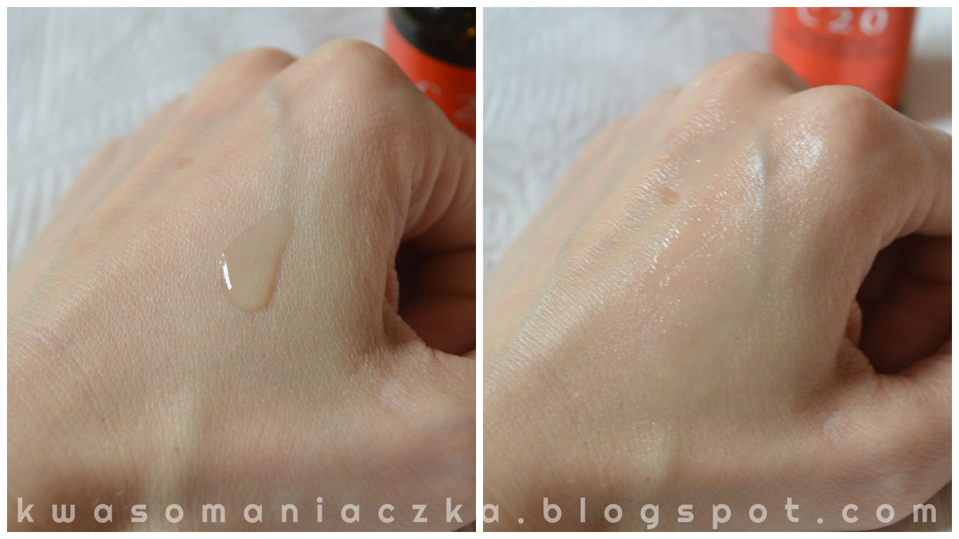 O.S.T. Original Pure Vitamin C20 Serum jest trochę gęste (coś jakby czysta gliceryna) ale dość łatwo rozprowadza się na skórze. Kolor jest prawie niezauważalnie żółtawy - i tutaj uwaga - bardzo szybko może się utlenić, więc lepiej trzymać je w lodówce i zaprzestać stosowania, gdy tylko zauważymy zmianę koloru na ciemniejszy. Generalnie będzie to 3 miesiące po otwarciu, gdyż kwas askorbinowy nie jest stabilną formą witaminy C i bardzo szybko ulega rozpadowi.