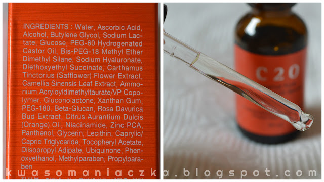 Serum pomimo niezbyt idealnego składu robi to, co powinno. Wygładzenie wynikające z delikatnego złuszczenia, rozjaśnienie przebarwień posłonecznych, nadanie skórze zdrowego wyglądu - tego możemy się spodziewać po tym produkcie. Dodatkowo odblokował mi pory :) Bezpośrednio po aplikacji skóra jest lekko lepka. Ja osobiście stosuję to serum wieczorem, bezpośrednio po umyciu i osuszeniu twarzy i czekam ok. 20 minut aby miało czas dobrze wniknąć w skórę. Dopiero później nakładam resztę produktów pielęgnacyjnych. Efekty zaczynają być widoczne po ok. 2 tygodniach, po ok 6-8 tygodniach widać już znaczną różnicę. Dodam, że właściwie nie mam plamek po stanach zapalnych, krostkach itp. więc nie mogę się odnieść do tego, jak szybko ten rodzaj przebarwień znika. Niektórzy podają, że już po tygodniu widać zmniejszenie zaczerwienienia. Jeśli kogoś interesuje ten temat, to warto poszukać również innych recenzji, które poruszają problem bardziej dogłębnie. C20 może podrażniać skórę, duże stężenie witaminy C plus alkohol może być terapią szokową dla skóry nie przyzwyczajonej do tego typu produktów. Myślę, że jest zbyt wysuszające dla suchej skóry. Nie zrobiłam zdjęć przed/po, jako że nie czuję się na to gotowa - to jedno. A drugie, że 2 tygodnie temu odstawiłam C20, żeby sprawdzić działanie serum z 5% niacynamidem - ale o tym niedługo :)